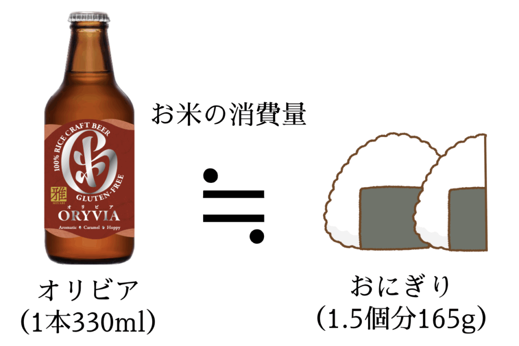 お米100%で製造されるORYVIAは、瓶1本でおにぎり1.5個分のお米を消費できるため、お米を「食べる」のではなく、「飲んで」消費する選択肢を提供することができ、晩酌にオリビアを1本飲むだけで1食分のお米需要に貢献できます(RICE HACK BREWERYは農林水産省の認定事業です)。